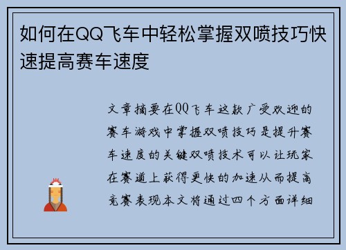 如何在QQ飞车中轻松掌握双喷技巧快速提高赛车速度